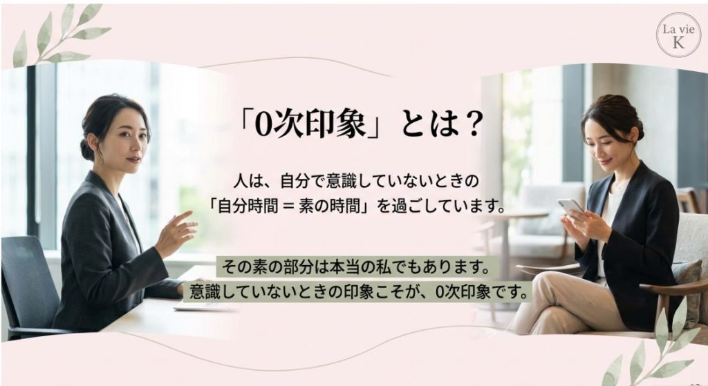 私たちは誰でも、自分で意識していない「自分時間=素の時間」を過ごしています。その無意識の時間に見せる表情や態度こそが「0次印象」です。